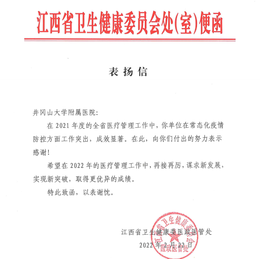 近日,江西省卫健委医政医管处向我院发布《表扬信》,对井冈山大学附属医院常态化疫情防控工作提出表彰。