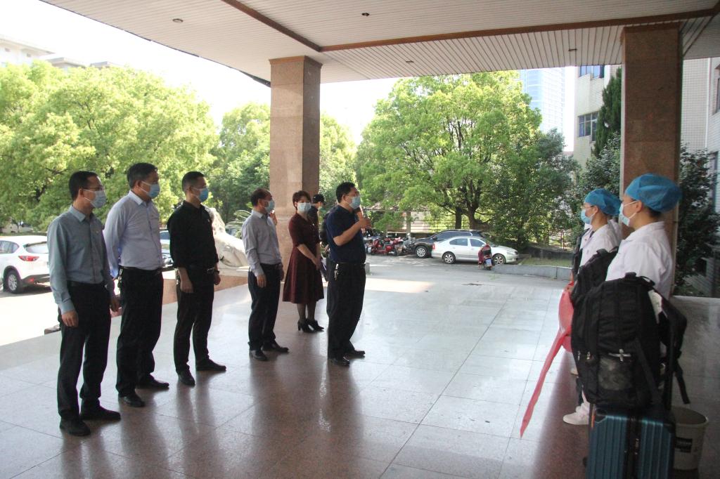 因上海疫情形势紧张,接到市疫情防控指挥部的通知,我院迅速组建了第二支援沪医疗队,她们是呼吸内科的王风婷、郭美莲,ICU的刘瑾、胸外科的万敏惠、康复科的李佳。4月12日上午,我院在临床医学院为她们举行了简短的出征仪式,院党委书记肖游章、院长谭立宇及其他院领导参加。