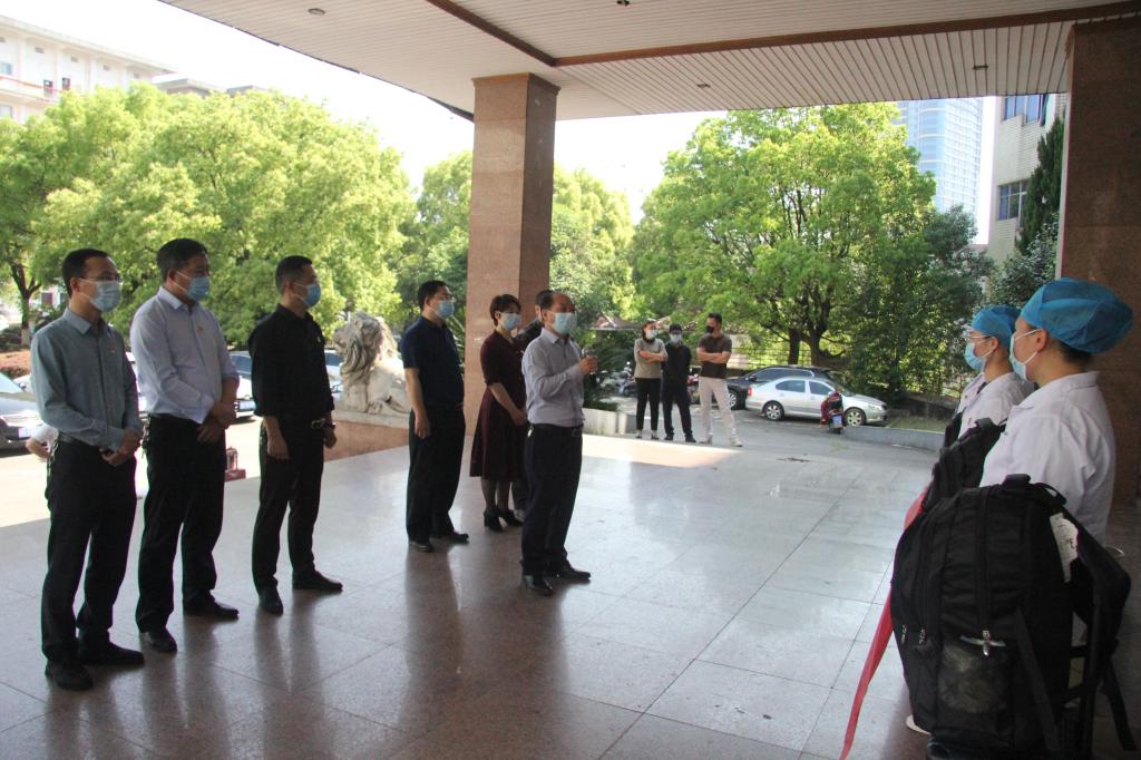 出征仪式上,肖游章向医疗队提出:要牢记医学生誓言,健康所系、性命相托;要牢记使命和责任,人民至上、生命至上,保障人民群众的健康;要牢记学校、医院广大干部职工及家属的嘱托,保护好自己,平安归来。