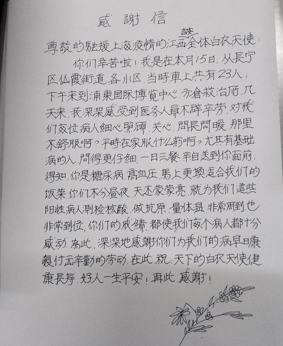 一系列的优质护理措施,得到了病人热烈的回响,截至目前,收到多位病人的感谢信。“感谢你们得知我是糖尿病、高血压,马上更换适合我的饭菜。”“感谢你们不分昼夜,天还蒙蒙亮,就为我们这些阳性病人测核酸、做抗原、量体温,照顾非常周到、到位。”“入住方舱的第五天就收到了可以出院的通知,那一刻居然有些不舍,习惯了每天被嘘寒问暖的感动,更习惯于大白装扮下你们那亲切的声音、阳光的笑容。”信中满满的都是这些话语。以病人为中心,围绕病人的需求,提高护理服务质量,为病人提供优质、高效、满意的医疗服务是我们的宗旨。为了更好的服务患者,我们特意又推出了患者留言本,希望“你的满意,是我们服务的宗旨;你的留言,是我们改进的开始”。(文/图 第一支援沪医疗队 朱锦娟 审核 黄军伟 彭晓露)