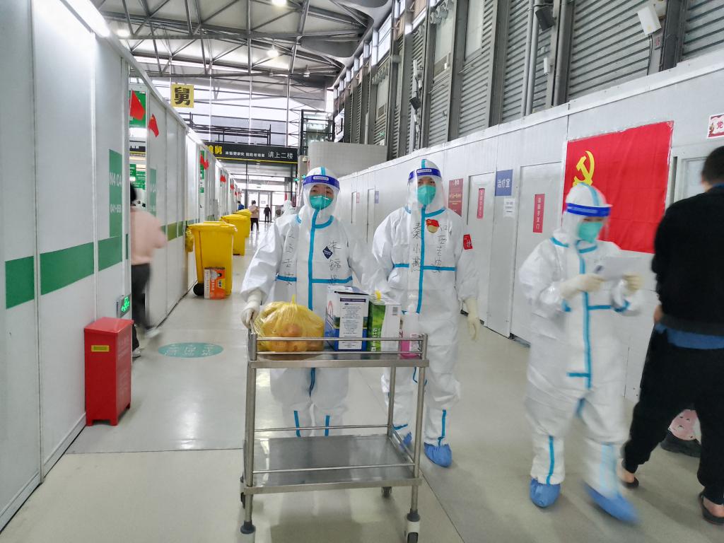 江西吉安援沪医疗队护理组组长、井冈山大学附属医院神经外科护士长肖晓春带领护理团队进舱与上海十院进行交接,吉安队共有133名护士,负责780张床位。