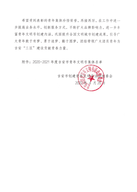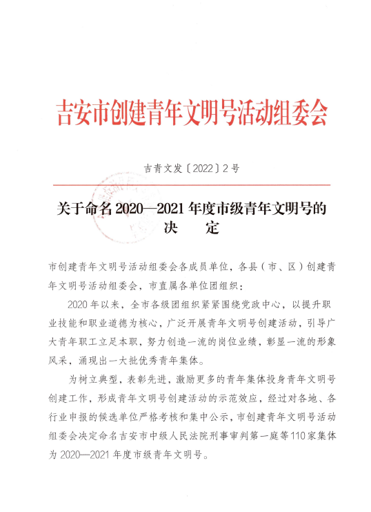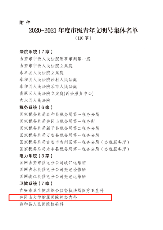 为树立典型,表彰先进,激励更多的青年集体投身青年文明号创建工作,形成青年文明号创建活动的示范效应,经过对各地、各行业申报的候选单位资格审核,严格评选,征求意见和集中公示等环节,市创建青年文明号活动组委会决定命名吉安市中级人民法院刑事审判第一庭等 110家集体为2020—2021年度市级青年文明号。其中,我院神经内科被评为2020—2021年度市级青年文明号。