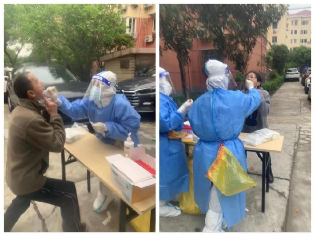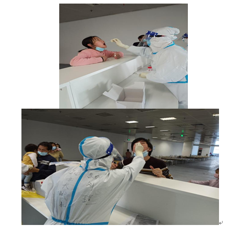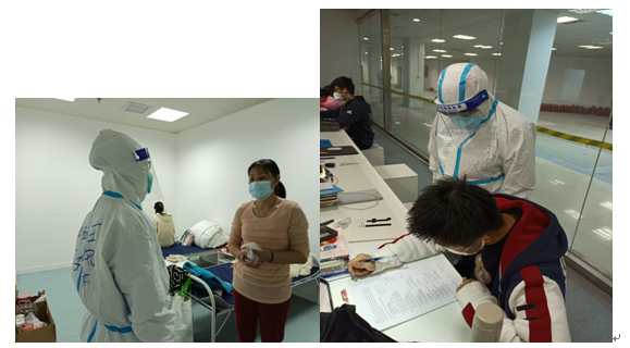 到上海的第二天我们就接到了核酸采样任务,我们整个吉安医疗团队169人除各小队队长外分成三队,协助上海各区卫生院完成4月14日核酸采样任务。早上5:30,我们第二小队35人就前往上海北蔡区卫生院等待任务分配,领队东方医院杨志龙医生,在出发前一直对我们再三交代“做好自我防护,安全完成任务。”我与郭美莲还有北蔡卫生院的韩医生,被分配一同前往两个封控小区进行核酸采样,这两个小区总人数约1700人。在驱车前往小区的路上韩医生告诉我们,他已经有半个多月没有回家了,一直在一线工作。抵达小区后我们即刻开始核酸采样工作,社区工作者和志愿者都非常配合我们,居民们也都自觉地间隔一米有序排队,很多人知道我们是江西吉安来的,不仅对我们表达感谢,也对吉安这座革命老城表示赞许,每每听到大家的“谢谢”我都会眼眶一热,不仅是因为我贡献了自己的力量,更为能发扬井冈山精神,而感到自豪和开心。我们采样的居民上至90岁老人,下至1岁4月婴孩均积极配合,采样工作有条不紊,进程顺利。当天完成采样工作回到住处时已是晚上8:00,总队长王金善院长和各队队长虽然没有参与采样任务,但也没闲着,他们进行了一天的开会讨论(方舱医院的建设、人员的分配、物资的调配等等工作),最终确定工作分配:我们169人分成三组分别接管三个方舱,我所在的保税区方舱60人,分成7组,可收治3500人。