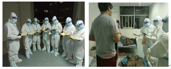 每次上班,我们组入舱后,组长王风婷都会先对我们进行工作安排,并带着我们巡视病房。有一次我们发现一位74岁老年男性患者,有高血压,冠心病史,且当时呼吸困难不能平卧,下肢水肿,考虑急性心衰,因方舱医疗条件有限,组长建议给予对症处理后立即转定点医院进一步救治,经过多方联系后安排刘瑾随120送病人两夫妻至周浦医院。