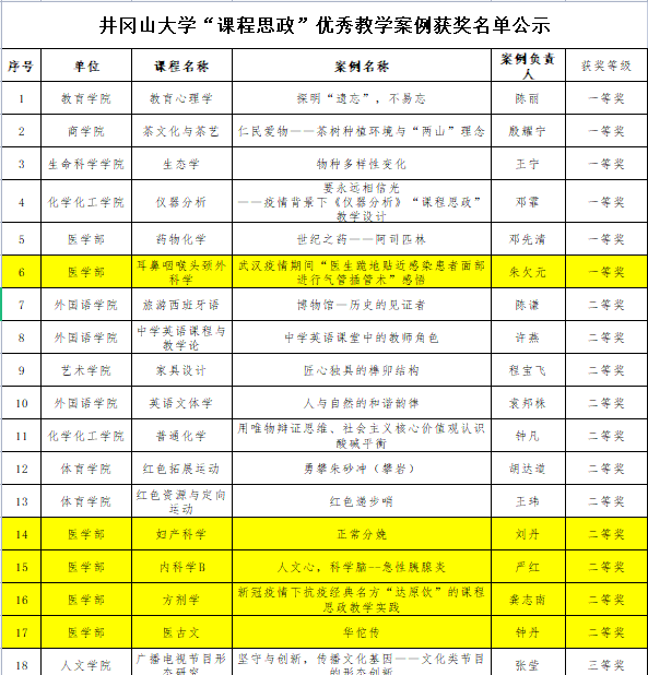 近日,井冈山大学举行“课程思政”优秀案例大赛,经过激烈角逐,临床医学院教师朱欠元荣获大赛决赛一等奖,刘丹、严红、龚志南、钟丹荣获大赛二等奖。