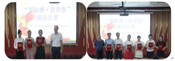 7月13日下午,由吉安市医院感染质量控制中心举办,井冈山大学附属医院承办的第二届“爱院感•致青春”演讲比赛在井冈山大学临床医学院图书馆六楼会议室成功举行。吉安市卫健委医政医管科科长邹建敏,井冈山大学附属医院副院长韦华璋出席颁奖仪式。