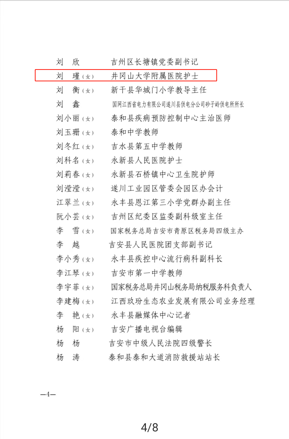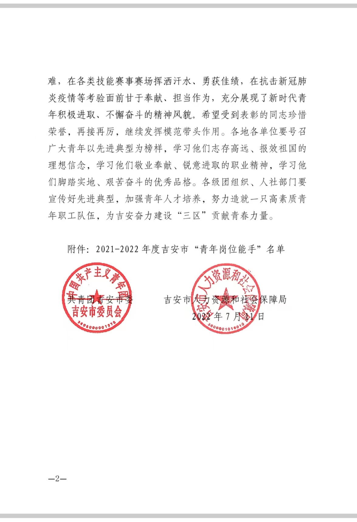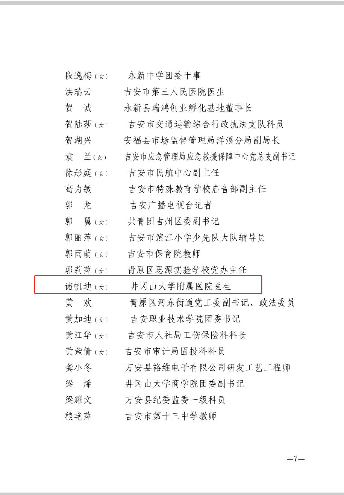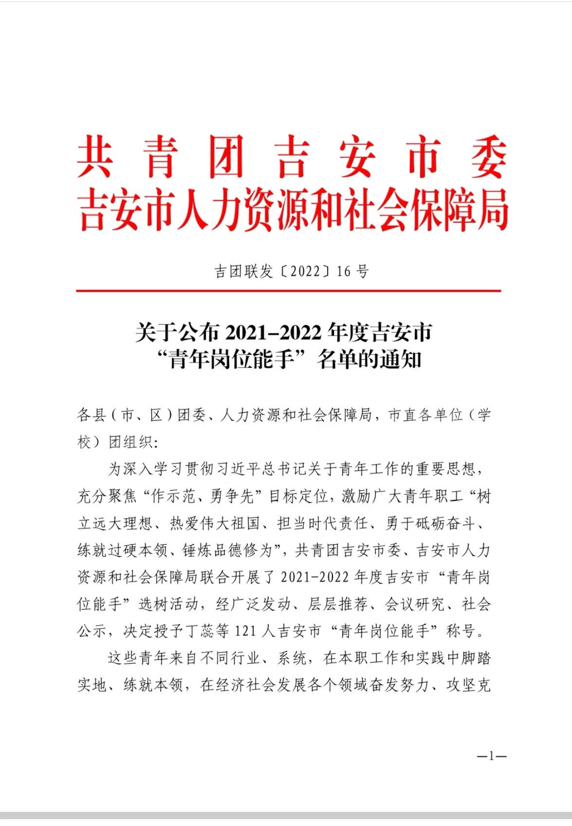 近日,共青团吉安市委员会、吉安市人力资源和社会保障局下发《关于公布2021-2022年度吉安市“青年岗位能手”名单的通知》,我院重症医学科护士刘瑾、口腔科医师诸帆迪两位青年荣获“吉安市青年岗位能手”称号。