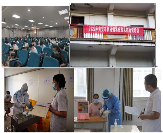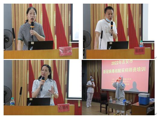 本次培训分两个阶段进行,上午为理论授课和实操示范,下午为技能考核。理论授课由市护理质控中心主任、井冈山大学附属医院护理部主任陈小英,市中心人民医院感染科熊洪海,市院感质控中心主任、井冈山大学附属医院感控科科长肖瑾瑛就《新冠病毒核酸检测标本采集规范》、《新冠病毒核酸检测标本釆集中的生物安全要求》、《新冠病毒实验室检测技术》、《强化疫情防控、感染控制相关知识》分别进行了专题讲座。技能培训由省级培训师资杨群及朱锦娟现场演示。带教师资通过现场示范和讲解方式,就防护服的穿脱、隔离衣的穿脱、口/鼻咽试子釆集技术等内容进行现场实操示范。
