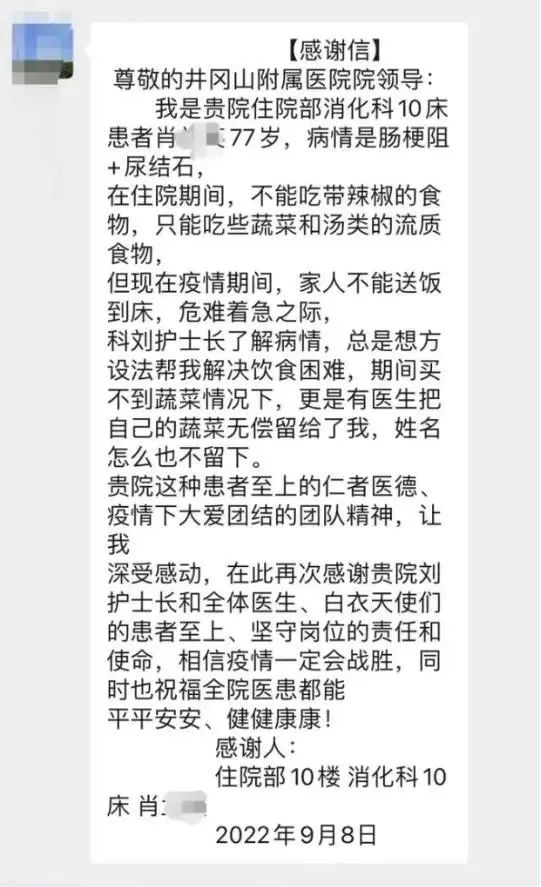 2022年9月8日夜,消化内科刘红护士长收到一段微信文字,打开一看,原来是近期出院的患者肖某某写来的一封感谢信。