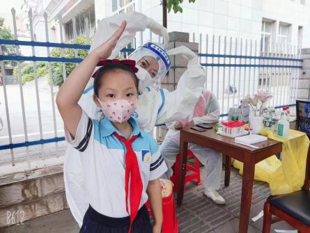 井冈山大学附属医院手术室护士张慧琳和消化内科护士刘卉茹是核酸采样队伍中的一对搭档。9月3日,在结束常规核酸采样工作后,发现石阳路小学的孩子们在一旁等候许久,带着水果、面包、牛奶等,准备向她们医护人员献礼,当小孩子们举起右手,目光炯炯地向她们行少先队礼的那一刻,“整个心都化了,特别感动,我们的工作很值得!”