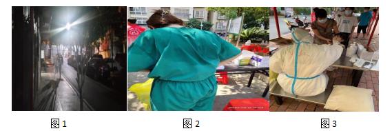 由普外科付鹏程医师、罗红及罗咪咪护士组成的普外科核算采样小队,每天起早贪黑(图1凌晨5点多出门采核酸)、汗流浃背(图2、3)的奔波在市区各个小区采核酸。每当他们完成一天的任务,衣服浸透、手掌皮肤打皱、脸上压痕明显时,没有亲身经历是体会不到这种辛苦,他们却云淡风轻的说:衣服湿了皮肤皱了倒没啥,主要是口渴不能喝水,尿急不能解小便那是比较痛苦的,喝水少又口渴,多喝点水又怕上厕所,确实有些两难。再苦再累,也必须按时按质完成任务,这种辛苦付出是值得的,希望吉安疫情早日散去,解除静态管理。