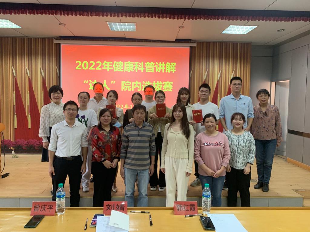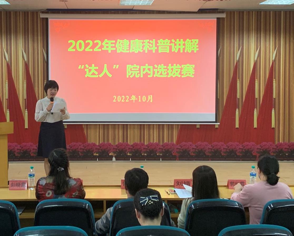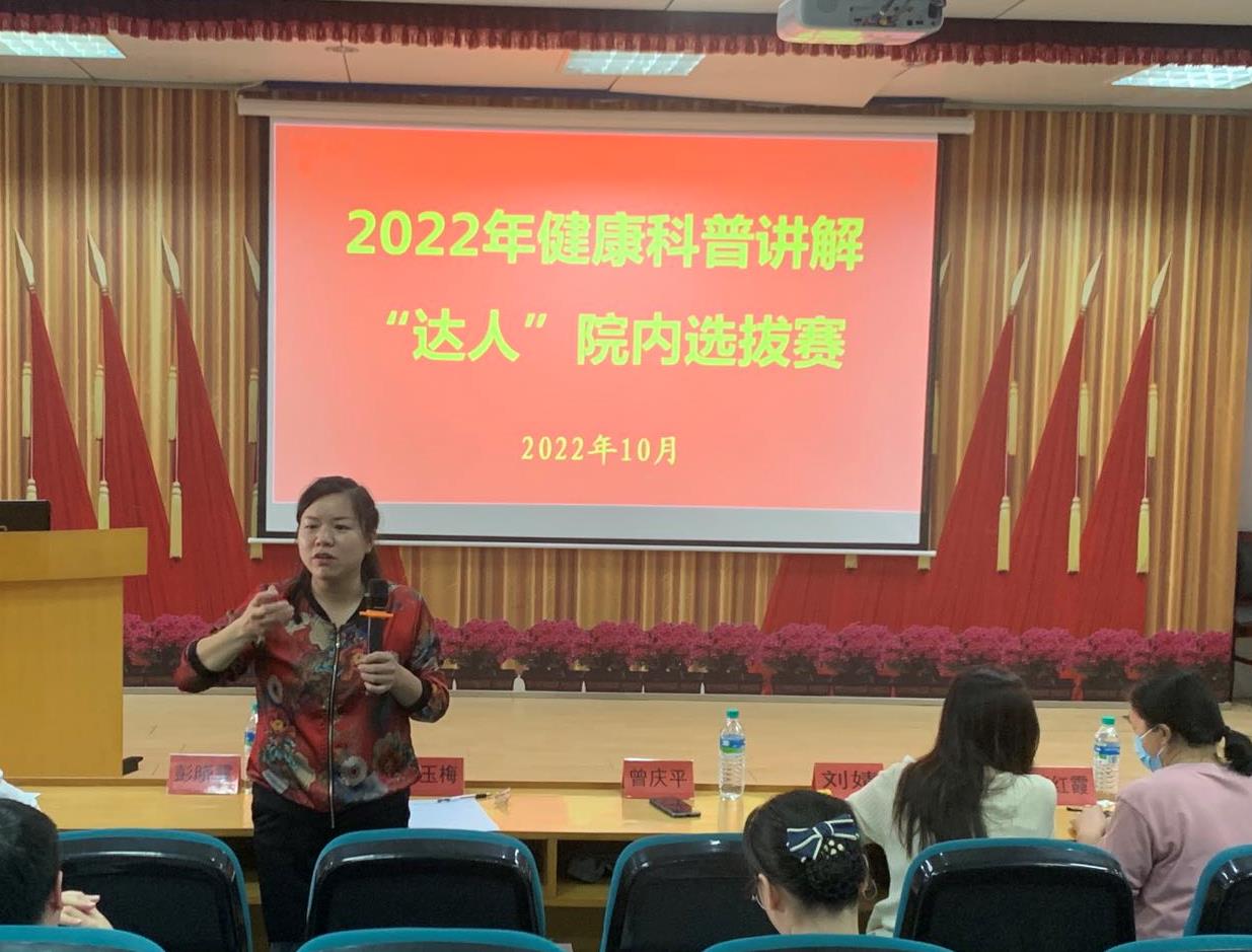 为深入贯彻落实习近平新时代中国特色社会主义思想和党的二十大精神,推进健康江西行动——健康知识普及行动,助力疫情常态化防控,进一步提升我院健康科普队伍科普能力,10月24日下午,医院在临床医学院图书馆六楼学术报告厅举行了2022年健康科普讲解“达人”院内选拔赛。