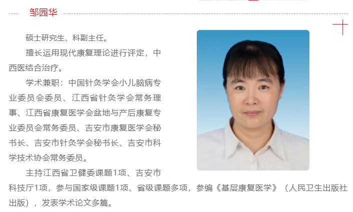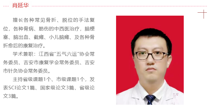 井冈山大学附属医院康复医学科是国家级住院医师规范化培训基地-康复医学基地,吉安市康复质量控制中心主任和吉安市康复医学会会长单位。目前现有医务人员19名,其中医生:高级职称3名,研究生5名;康复治疗师:中级职称2名;护士:高级职称1名,中级职称5名。其中7名医生、治疗师已取得高校教师资格证,并在井冈山大学任教《物理治疗学》、《作业治疗学》、《肌肉骨骼康复学》、《神经康复学》等康复专业课程。我科已成熟开展神经康复、骨关节康复、脊髓损伤康复、老年病康复、慢性疼痛康复及心肺康复等多种康复方向,下设康复评定、运动疗法、作业疗法、言语治疗、吞咽治疗、认知训练、物理因子疗法、中医传统治疗等治疗组。
