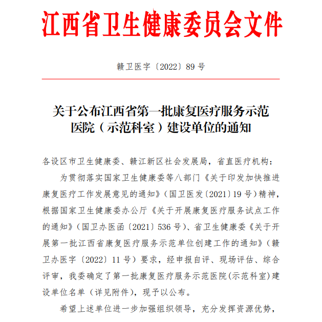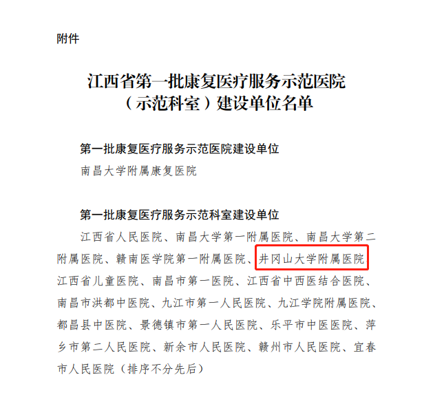 近日江西省卫生健康委员会公布了全省第一批康复医疗示范医院(示范科室)建设单位名单,井冈山大学附属医院成功上榜,成为吉安市唯一一家获批建设单位。这标志着我院康复医学科在学科建设、服务水平等方面获得了省卫健委的充分认可!