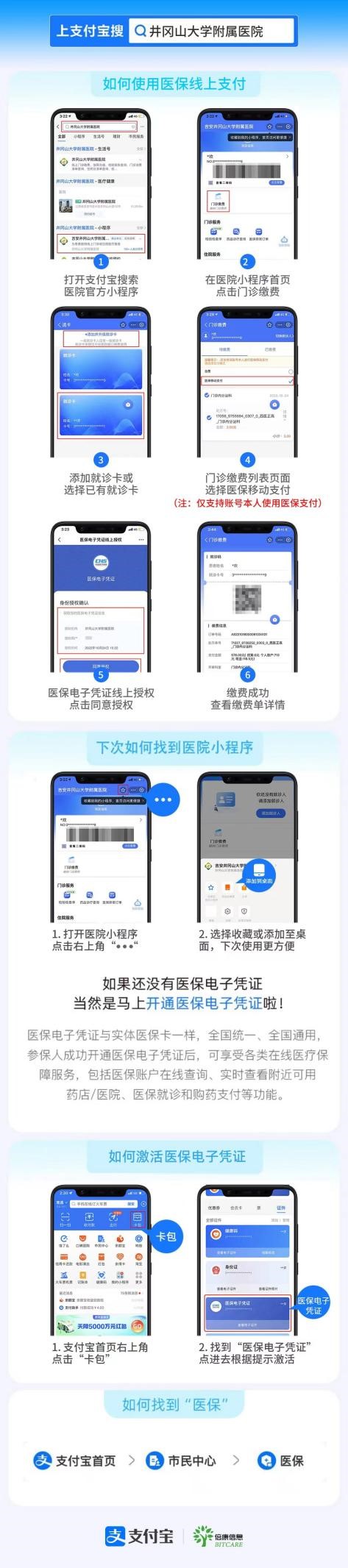 井冈山大学附属医院医保移动支付功能于11月2日正式上线,标志着我院正式步入医保移动支付时代。今后广大群众来我院就诊,无需前往窗口挂号排队,在手机上即可完成挂号建卡,生成就诊二维码后,即可前往对应诊室就诊。就诊完成后无需前往收费处排队,手机端即可完成医保基金和个人现金融合支付,前往药房通过手机出示就诊二维码,即可完成取药过程。就医群众仅需一部手机,即可享受从挂号建卡、就诊到结算、取药,全流程线上医疗服务,彻底告别实体卡和纸质二维码,告别收费窗口和自助机,告别排队缴费。(具体操作流程图和操作视频附后)