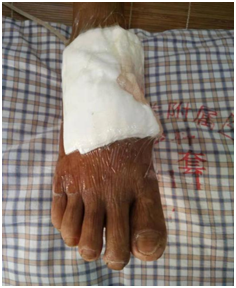 案例1(糖足):患者王某,糖尿病十余年,因突发晕厥由路人送至我院急诊治疗,后发现左下肢溃烂,经清创采用自制式VSD(材料费一百元)后患者水肿于第三天明显消失。