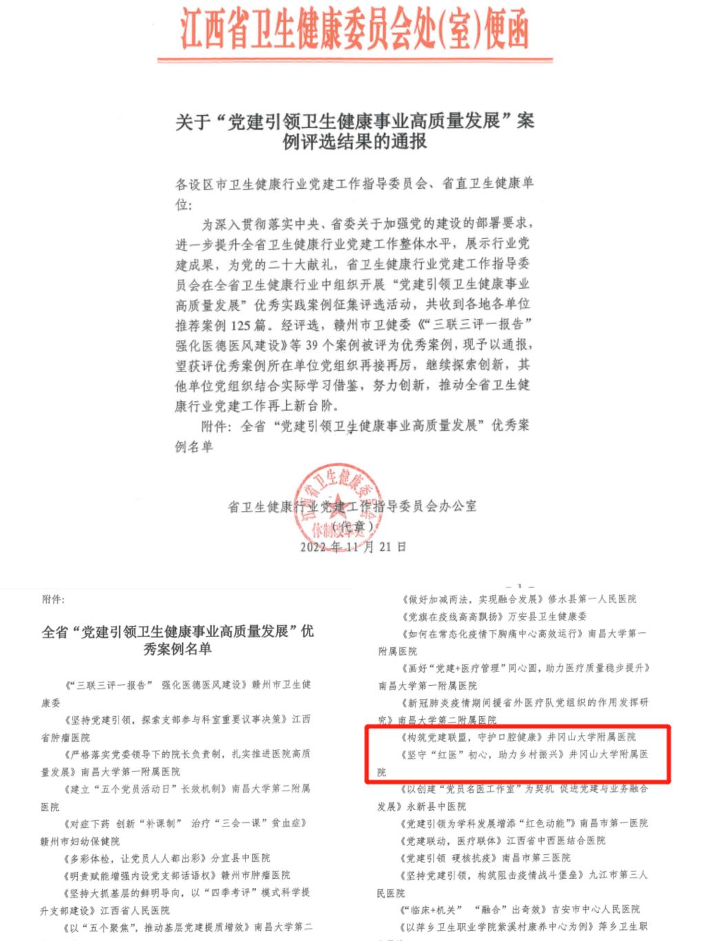 近日,江西省卫生健康行业党建工作指导委员会在全省卫生健康行业中组织开展“党建引领卫生健康事业高质量发展”优秀实践案例征集评选活动,我院申报的《坚守“红医”初心,助力乡村振兴》《构筑党建联盟,守护口腔健康》2个案例在全省125个案例中脱颖而出,被评为优秀案例。(文/图 陈娟 审核 彭晓露)