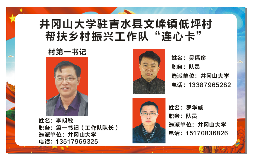 按照“有事请找我,我为你服务”的办事宗旨,为民办实事、办好事,我们驻村工作队制作并发放井冈山大学驻村工作队“连心卡”300张,方便村民联系,打通了为群众服务的“最后一公里”,叫响了“有困难找党员、要服务找支部”的服务品牌。依托医院的医疗资源优势,推动优质医疗卫生资源不断向农村一线延伸,医院在低坪村卫生室设立了“井冈山大学附属医院乡村振兴医疗保障帮扶点”,同时医院全国样板党支部内科第一党支部与低坪村党支部正式结对共建,充分发挥了党建引领同频共振作用,构建了高校与农村基层党支部党建工作新格局,将健康和实惠直接送到村民“家门口”。