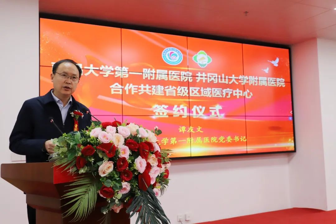 谭友文表示,南大一附院与井大附属医院多次携手合作,共度时艰,结下了深厚的友谊,此次合作共建省级区域医疗中心,标志着双方关系进入一个新的发展阶段。希望双方一要高起点谋划未来发展。建设井冈山大学附属医院省级区域中心,是井冈山革命老区、吉安市全体人民的民心工程,要以新综合大楼正式搬迁为契机,立足急危重症功能定位,科学布局学科发展,高效推进各项工作;二要高标准加强学科建设。双方要聚焦急危重症相关学科,以人才交流为契机,切实推进技术、管理、品牌三个运营,依托互联网+先进技术,尽快实现井大附院与南大一附院医疗规范、质量标准、教育培训三个统一,实现医教研管同质化发展;三要高质量打造区域示范。两院全体干部职工要团结一心,以引领井冈辐射江西为目标,打造集优质医疗服务、医学科研和人才培养为一体的发展高地,全面提升吉安市急危重症医疗能力,让吉安市群众大病不出市,在全省乃至全国形成良好的示范效应,让井冈山精神放射出新的时代光芒。