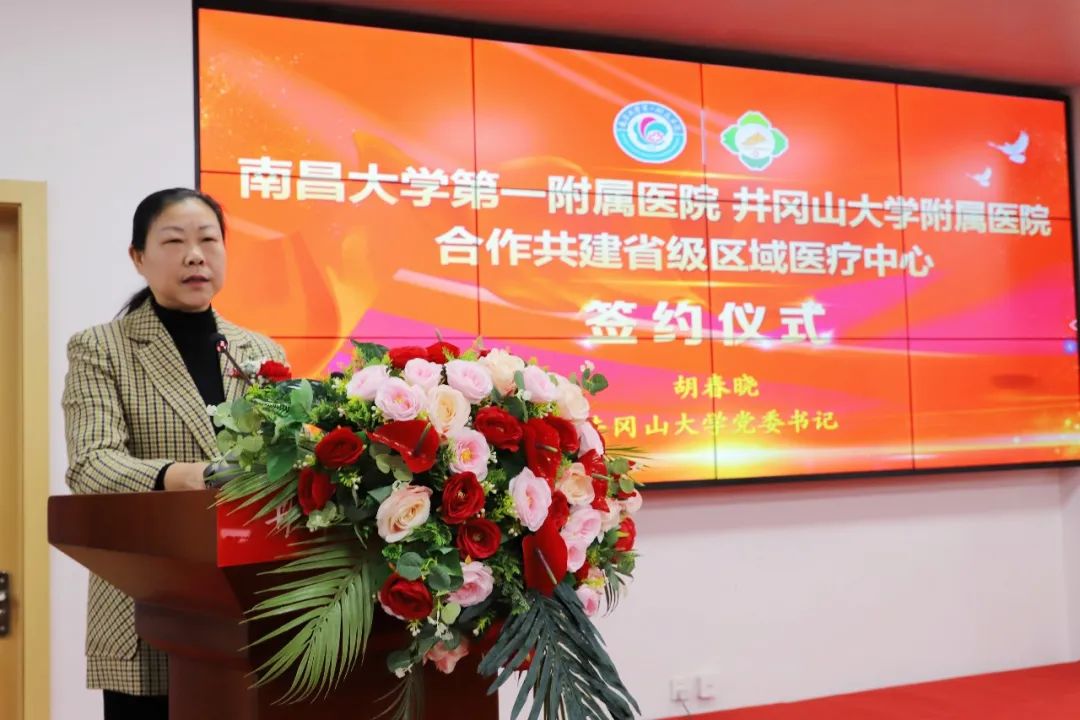 胡春晓指出,建设省级区医疗中心是党中央、国务院为促进优质医疗资源扩容和均衡布局做出的重大决策部署,是解决群众看病远看病贵看病难的民生工程。她表示,南昌大学第一附属医院作为全省综合实力最强的龙头医院,与井大附属医院合作共建省级区域医疗中心,是贯彻落实党的二十大精神、推进健康中国建设的具体体现,是服务幸福江西建设和助力吉安建成全省共富共享美好生活实践区的重要举措,也是共同谱写院际合作共同发展新篇章的重要开端。她强调,井大附属医院全体班子和干部职工,要以合作共建为重大发展契机,主动强化与南大一附院的紧密合作,充分学习借鉴技术、管理、品牌等方面优势,全面推进医教研“三位一体”协同发展,引领区域基层医疗机构高质量发展,切实满足老区人民对高水平医疗服务的美好期盼。