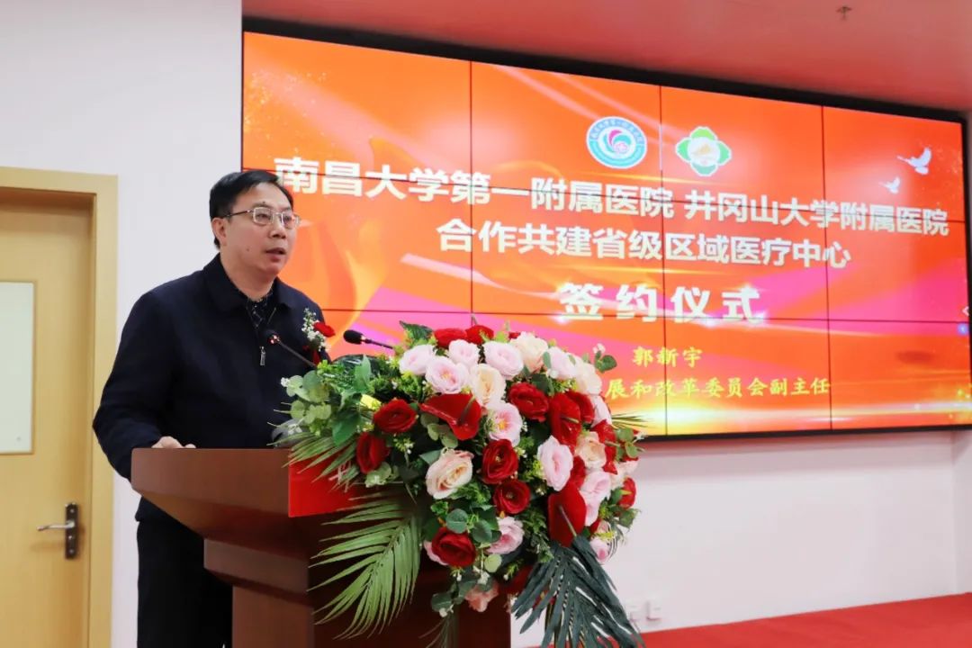 郭新宇强调,省委、省政府高度重视卫生健康事业的发展,把国家区域医疗中心、省级区域医疗中心建设项目作为全面建设社会主义现代化江西的一项重大民生工程进行统筹谋划、全力推进。经过全省上下共同努力,我省南大一附院等7家医院获批建设国家区域医疗中心、井大附属医院等4家医院获批建设省级区域医疗中心,均将在“十四五”末期全部建成,届时可基本实现4500多万赣鄱儿女大病不出省、就近享有高水平医疗卫生服务。省发改委将按照省委、省政府部署要求,全力支持井冈山大学附属医院急危重症救治中心加快建成,更好护佑人民生命健康。衷心期盼南大一附院情系革命老区,进一步加强与井大附属医院的全面合作,高标准、高质量、高效益助推省级区域医疗中心建设,推动优质医疗资源全方位、深层次、多维度向老区群众身边延伸,为加快构建江西医疗卫生事业新发展格局,谱写社会主义现代化新篇章作出新的更大贡献。