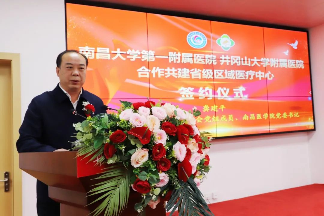 龚建平指出,建设省级区域医疗中心是党中央、国务院促进优质医疗资源扩容和均衡布局,省委省政府推进健康江西建设,推动全省卫生健康事业高质量发展作出的重大决策部署,也是减少人民群众看病难、看病远的重大举措。他表示,此次南大一附院与井大附院合作共建省级区域医疗中心,开启了我省省市共建省级区域医疗中心的先河,是不忘初心使命,传承跨越时空的井冈山精神的生动体现。强调双方要认真学习贯彻党的二十大精神,认真贯彻落实党中央、国务院和省委、省政府决策部署,坚持以人民健康为中心,聚焦打造医疗龙头,深化合作共建,针对性补短板、强弱项,推动优质医疗资源扩容下沉,降低治疗费用,减少跨区域就医,让广大群众就近享受优质便捷的高品质医疗服务;要对标省级医疗中心建设要求,统筹推进医院的基础设施、重点学科、人才队伍等建设工作,尽快实现诊疗水平同质化,不断提升省级区域中心的功能和承载能力;要深化改革创新人才技术、品牌和管理模式,建立健全现代医院管理制度,确保优质医疗资源引得进、用得快、留得住、用得好,引领区域医疗技术发展,更好地保障人民群众健康。