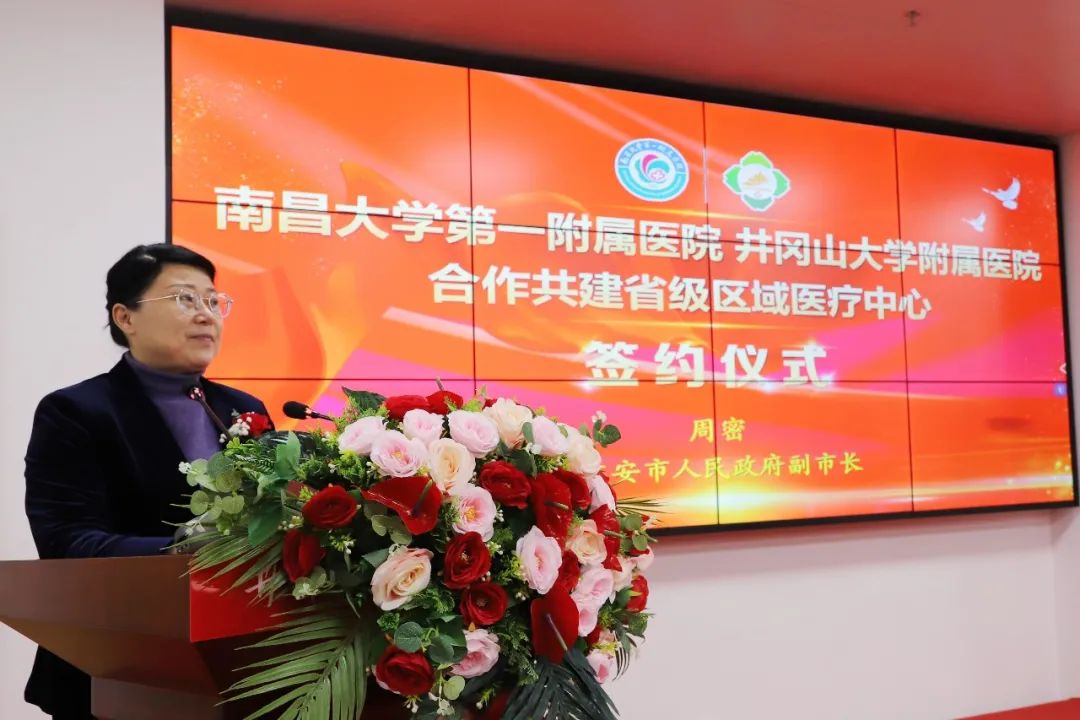 周密指出,近年来我市把保障人民生命安全与身体健康作为优先发展战略,积极践行以人民为中心的发展思想,以大改革引领大发展,大力引进高层次医疗人才,持续优化市中心城区医疗资源布局。一直以来,南昌大学一附院依托自身强大的综合实力,在医疗服务、学术交流等方面给予我市大力支持,为吉安老区群众健康提供了有力支撑,展现了名校大院的深厚为民情怀和强烈使命担当,特别是2022年9月我市突发疫情,张伟院长亲自带领南昌大学一附院医务人员亲历驰援一线,为我市从快从重打赢疫情防控歼灭战发挥了重要作用,作出了突出贡献。此次与井大附院签约合作共建省级区域医疗中心,是我市医疗卫生事业的又一件大事喜事,希望井大附属医院以此次签约为契机,抢抓机遇,担当作为,高标准推进区域医疗中心建设,不断提升医疗质量和服务水平,在推动公立医院高质量发展上打造品牌、做出示范,为建设健康吉安,惠及民生福祉作出新的更大贡献。市委市政府将履行属地责任,积极做好服务保障,创造有利条件推动双方合作取得更加丰硕的成果。