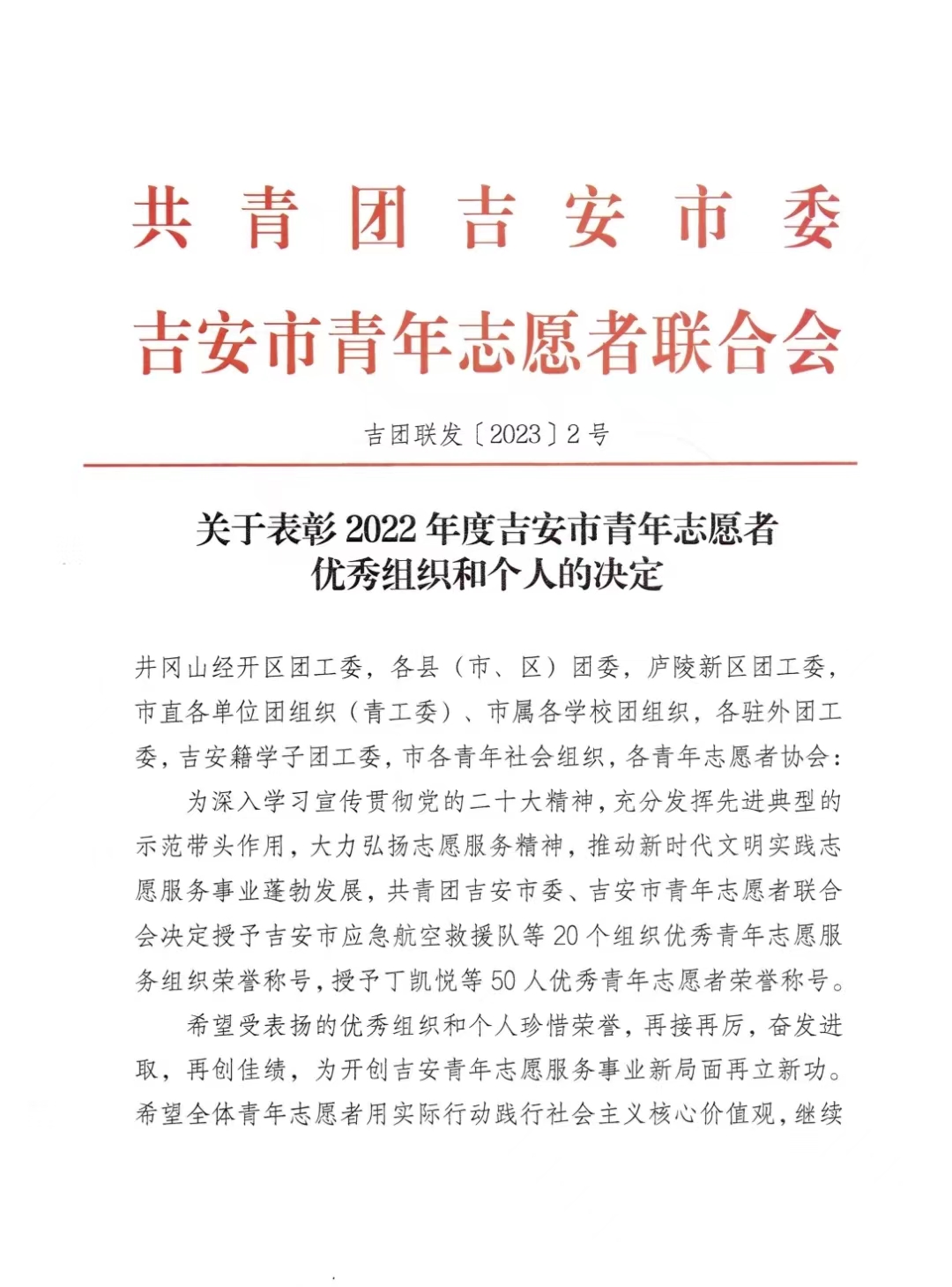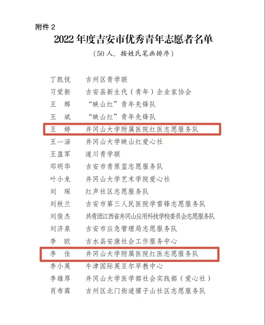 井冈山大学附属医院王婷、李佳两位同志荣获“吉安市优秀青年志愿者”称号。