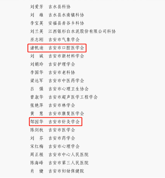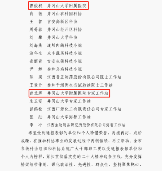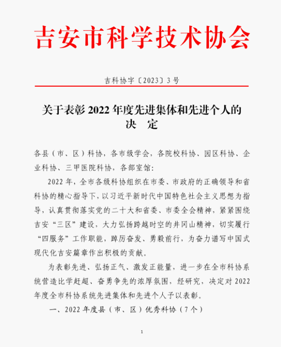 近日,吉安市科学技术协会印发《关于表彰2022年度先进集体和先进个人的决定》 (吉科协字〔2023〕3号),井冈山大学附属医院四位同志获2022年度吉安市科协工作先进个人:诸帆迪(吉安市口腔医学会)、黄慧(吉安市康复医学会)、邹园华(吉安市针灸学会)、曾俊权(井冈山大学附属医院)、曾兰辉(井冈山大学附属医院专家工作站),恭喜以上五位同志,望再接再厉,再创佳绩!(供稿:科教科 审核:曾俊权 彭晓露)