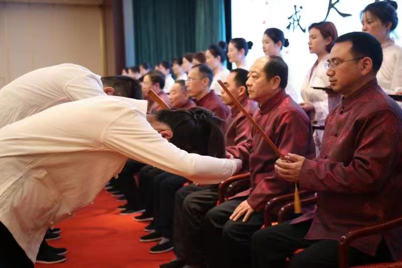 拜师仪式主要有盥洗礼(净心洗手,去杂存精)、拜先贤(岐伯)、呈拜师贴、献六礼束脩、敬茶、戒尺加身、赠回徒贴、师长回礼、向师长行礼、弟子宣誓明志、师长代表彭望发言、弟子代表温梦雪发言等环节。读拜师帖、呈敬礼茶、行谢师礼,继承人用传统的仪式隆重地表达对师长的尊重,至此30名继承人正式开启“拜师学艺”之路。