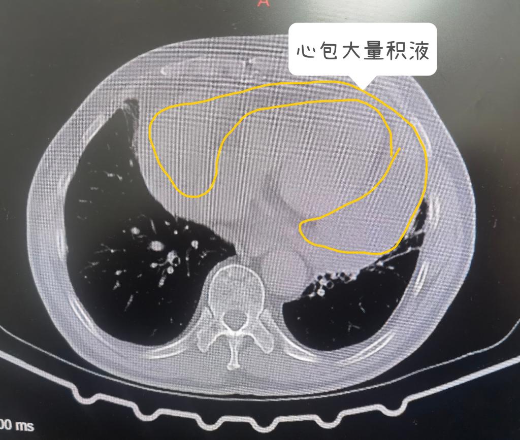 患者为一位59岁男性,4个月前因外伤后出现反复胸痛胸闷,加重1月入院,无呼吸困难,外院行胸部CT检查提示:心包积液(中度),未予以特殊治疗。1月前患者感明显胸闷,活动后加重,外院行心脏彩超检查提示:大量心包积液。此次为求进一步治疗遂来我院就诊,门诊拟“心包积液”收治入院。术前检查心脏彩超提示: 心包大量积液;左心耳区低无回声(血栓?)胸部CT提示:心包腔大量积液。