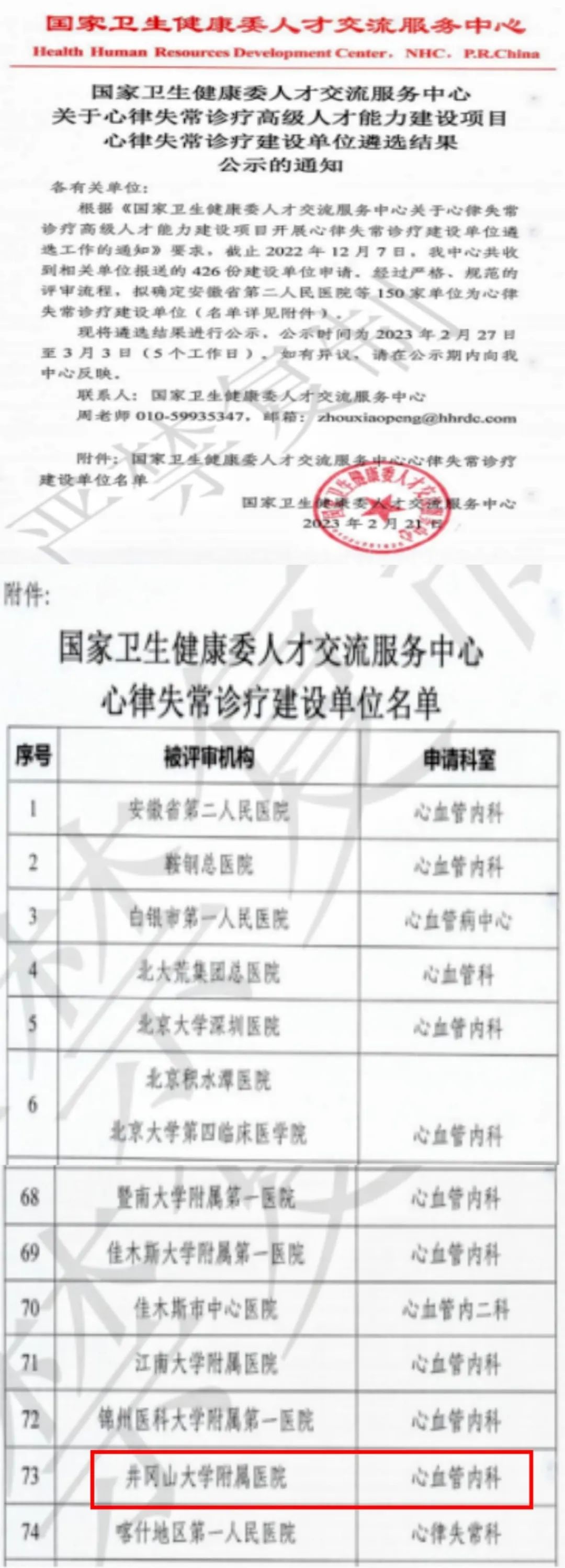 近日,国家卫生健康委人才交流服务中心公布了关于心律失常诊疗高级人才能力建设项目心律失常诊疗建设单位遴选结果名单,井冈山大学附属医院心血管内科获批成为全国心律失常诊疗建设单位之一,国家卫健委人才交流服务中心开展此项目旨在提升建设单位的规范化诊疗能力,使建设单位成为省级心律失常示范单位。