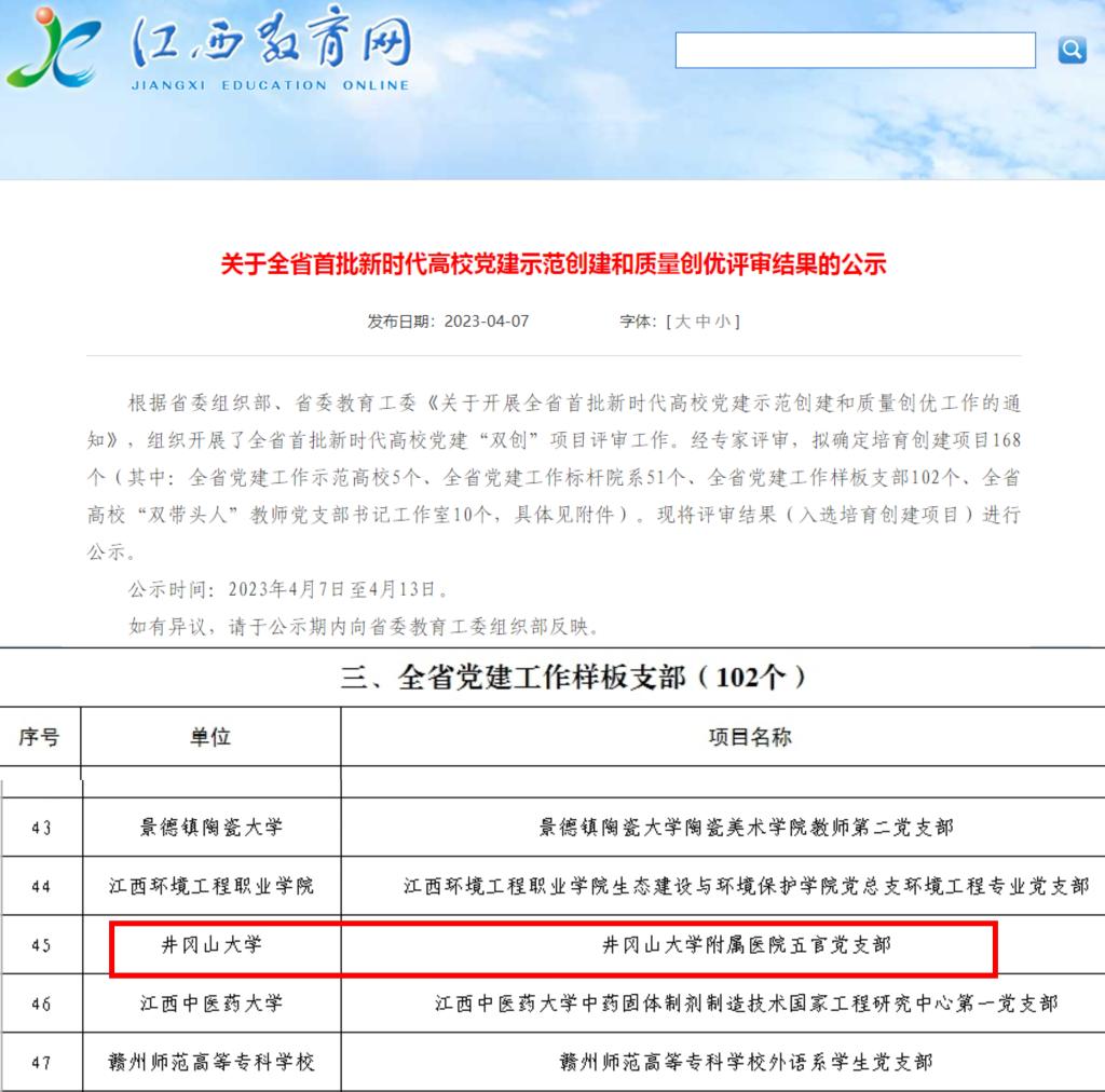 4月7日,江西省委教育工委公示了全省首批新时代高校党建示范创建和质量创优评审结果,井冈山大学附属医院五官党支部入选全省党建工作“样板支部”。自此,井冈山大学附属医院党委成为井冈山大学首个均获国家级和省级“样板支部”创建单位的基层党委。(2022年3月内科第一党支部获批第三批新时代高校“全国党建工作样板支部”培育创建单位。)