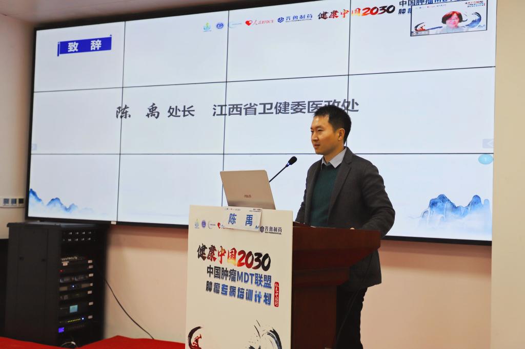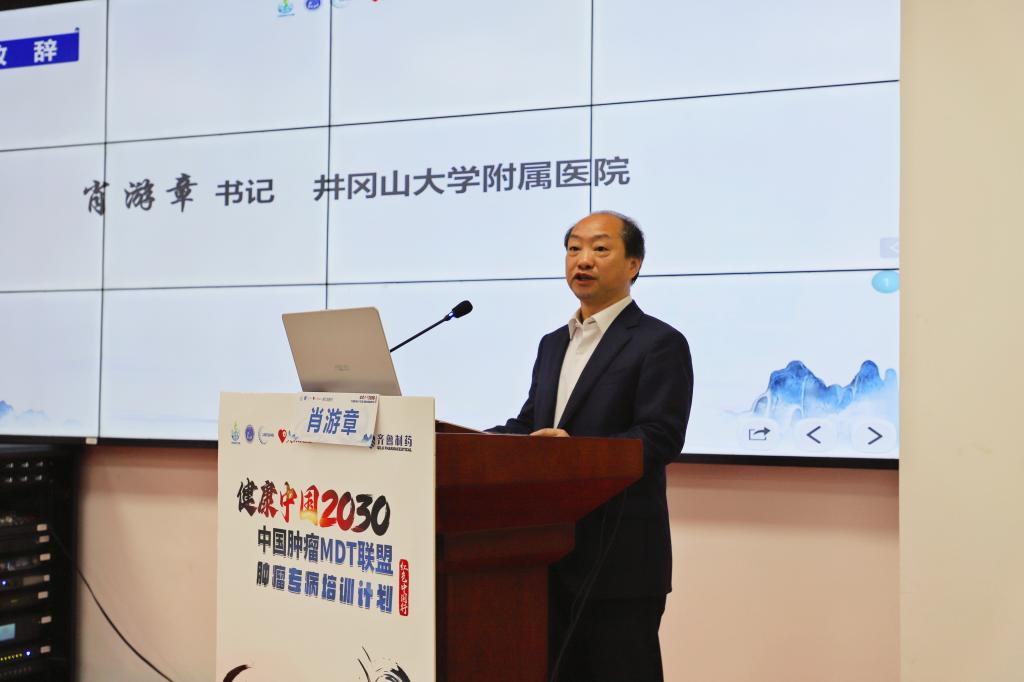 北京大学人民医院胃肠外科主任叶颖江,北京大学肿瘤医院消化肿瘤内科主任沈琳,江西省卫生健康委医政医管处副处长陈禹,井冈山大学附属医院党委书记肖游章分别致辞。北京大学人民医院姜可伟教授主持。井冈山大学附属医院党委委员,副院长韦华璋出席会议。普通外科、呼吸与危重症医学科、肿瘤放疗科、医务科等相关科室医务人员参加会议。