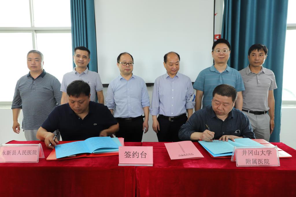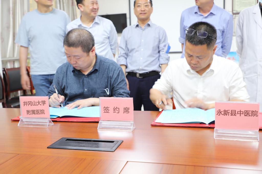 韦华璋与永新县人民医院院长吴建军签订合作协议。