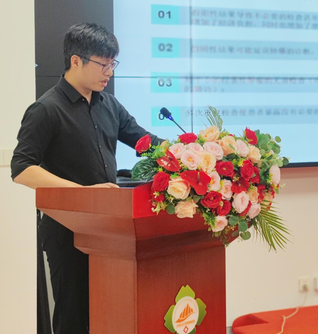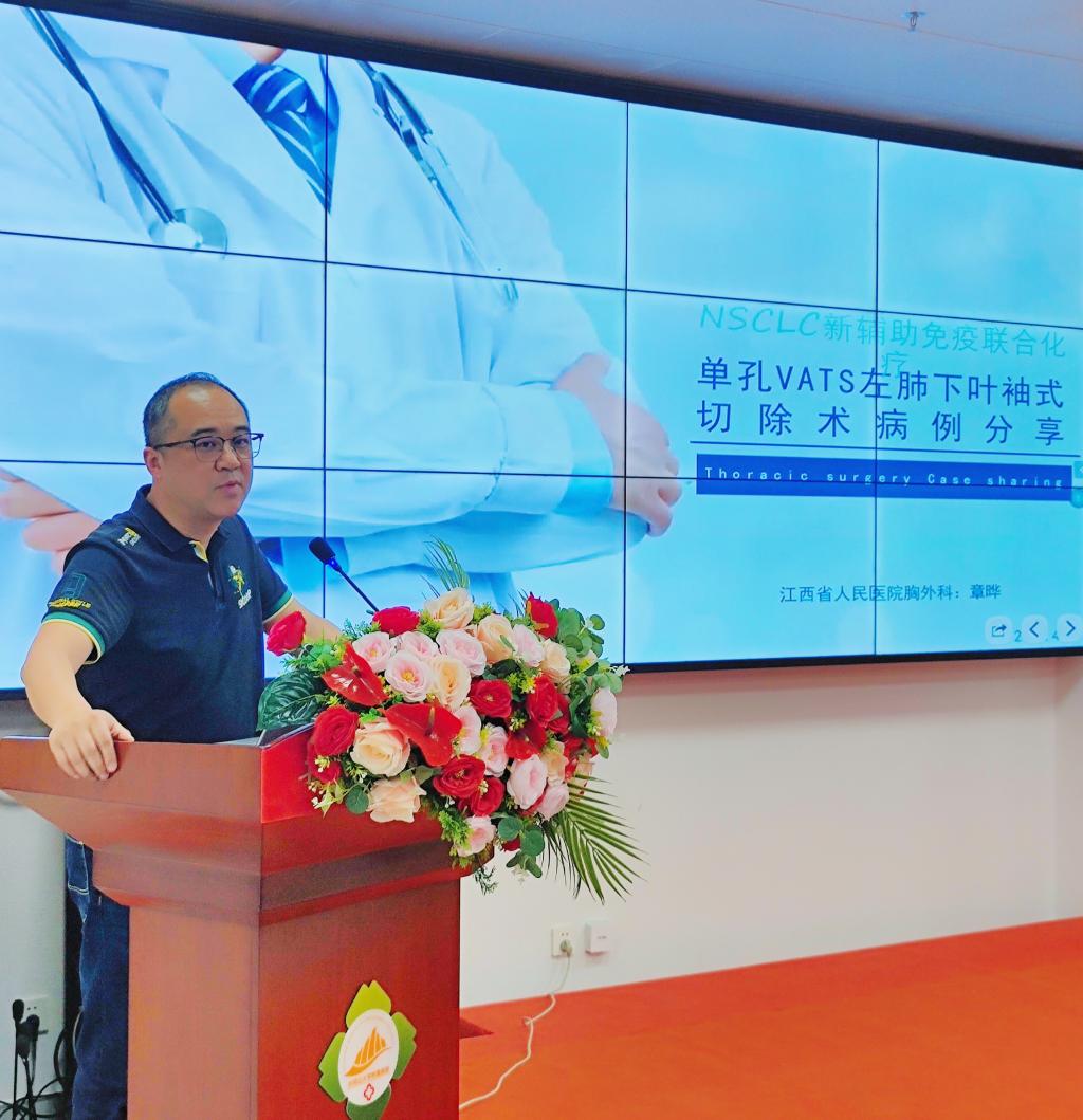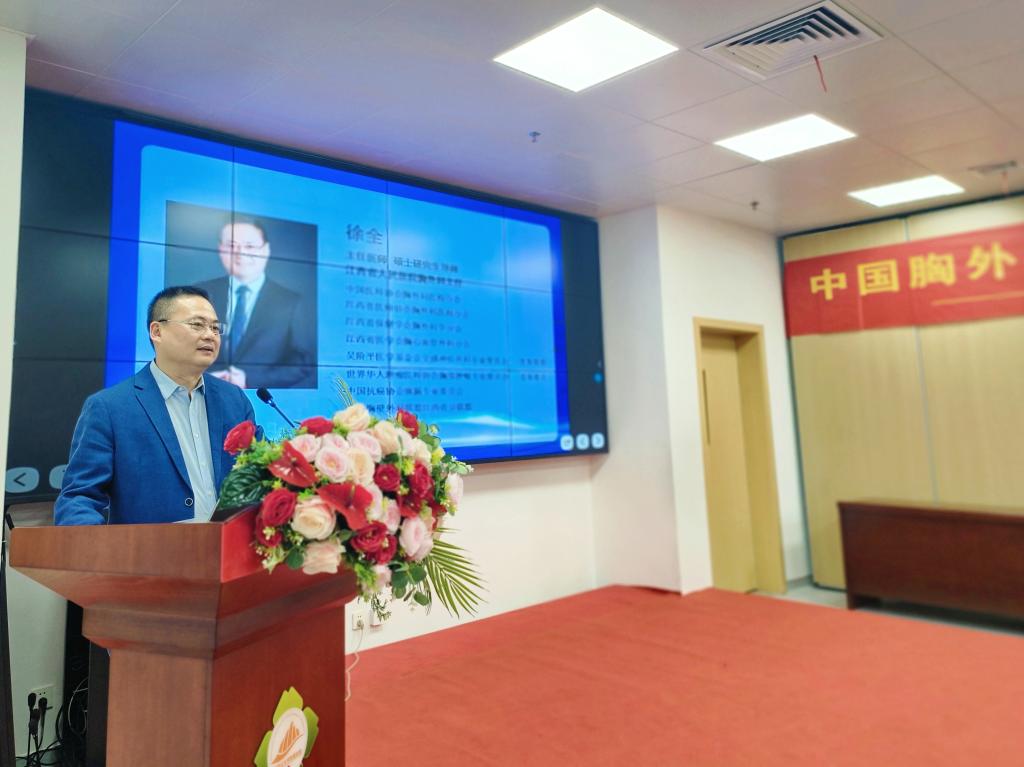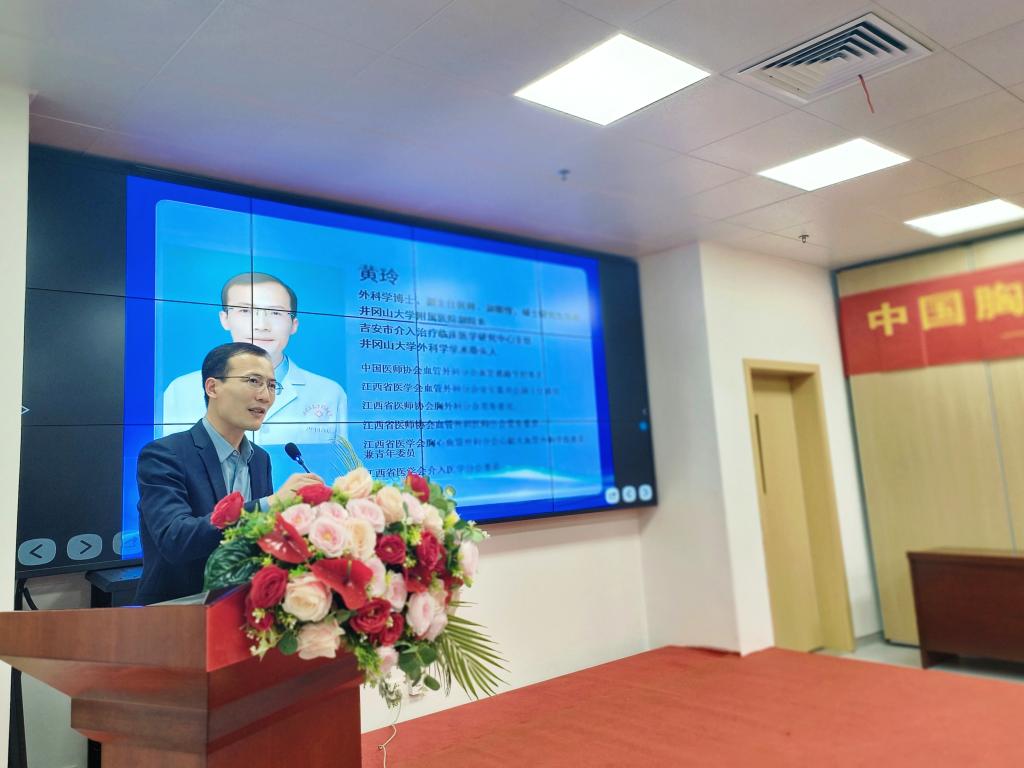 井冈山大学附属医院党委委员、副院长黄玲致辞。江西省人民医院胸外科主任徐全,主任医师章晔带领的专家团队一行出席,我院胸外科主任蔡其桂主持。心胸大血管外科、放疗科、影像科、胸外科医务人员和相关科室人员参加了会议。
