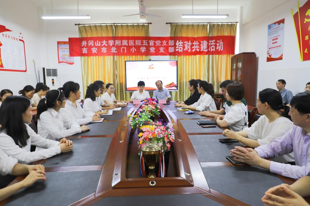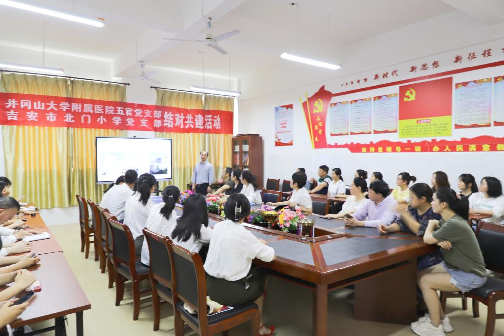 本次活动以支部共建为主要落脚点,旨在进一步增强党组织的凝聚力和战斗力,发挥支部互补优势,拓展共建内容和范围,推进党建与工作相结合。井冈山大学附属医院党委书记肖游章,北门小学党支部书记曾剑雯出席活动。五官科党支部29名医护党员和北门小学28名教师党员参加。