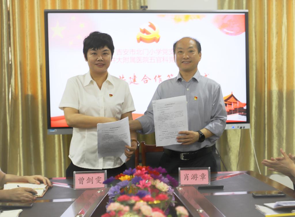 井冈山大学附属医院党委书记肖游章和北门小学党支部书记曾剑雯共同完成了党建共建合作的签约。