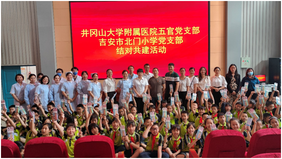 为深入开展学习贯彻习近平新时代中国特色社会主义思想主题教育,结合支部实际,丰富学习形式,创新行开展主题教育活动。5月17日,井冈山大学附属医院五官党支部与吉安市北门小学党支部在北门小学开展了“学思深悟二十大 同心共赴新征程”主题的结对共建活动,促进健康科普进校园。