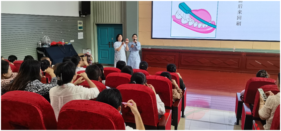 口腔科医生王丹妮通过视频播放和现场演示的方式对50多名老师们进行了系统的、细致的科学有效刷牙的科普培训,根据共建活动的安排,每个班级的老师将在下一次的主题班日活动中对本班学生进行正确刷牙方法的培训。