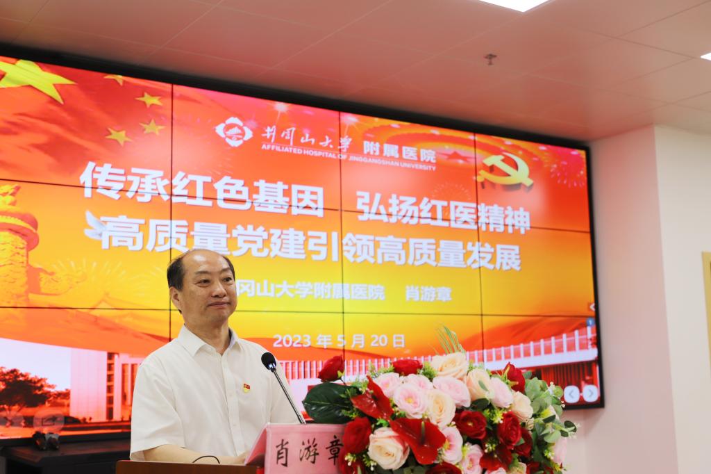 肖游章以《传承红色基因,弘扬红医精神——高质量党建引领高质量发展》为题讲了一堂专题党课,从井冈山是红医精神的重要孕育地和发源地、红医精神的基本内涵和主要内容、在新时代医院党建实践中传承好、发扬好红医精神等三个方面,深刻解读红医政治坚定、对党忠诚的理想信念;救死扶伤、敬佑生命的革命人道主义精神;为民服务、无私奉献的宗旨意识;艰苦奋斗、埋头苦干的优良作风;求是创新、技术优良的科学精神。