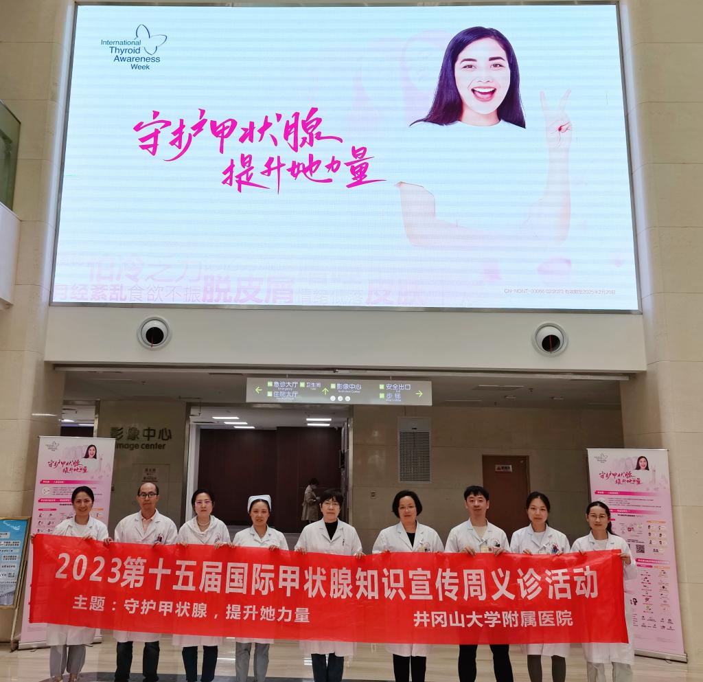 5月22-28日是第15个国际甲状腺知识宣传周,主题为“守护甲状腺,提升她力量”。为深入学习贯彻习近平新时代中国特色社会主义思想主题教育,牢牢把握“重实践、建新功”的总体要求。提升公众,特别是女性市民对甲状腺疾病的认识,普及其症状及危害,呼吁对甲状腺疾病做到早预防、早筛查、早诊断。5月24日,井冈山大学附属医院内分泌科联合普通外科、功能科(B超室)等相关学科,在新院区门诊大厅开展多学科义诊活动。