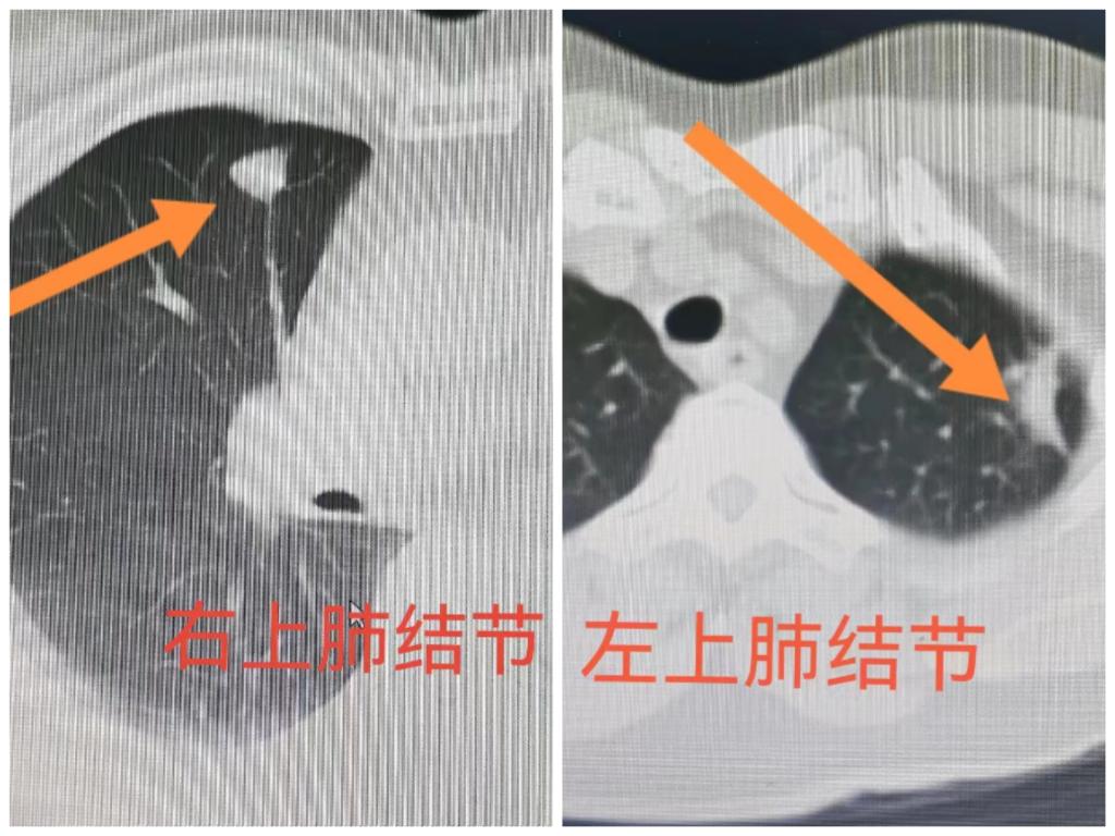 患者是我院在青原区富田镇开展肺癌免费筛查公益行动免费行CT检查时发现双上肺结节,左上肺上叶结节,大小约19.5X11.5mm,临近胸膜牵拉,右肺上叶结节,大小约12.2X10.0㎜。第二天办理住院后完善增强CT示:右上肺结节恶性可能性大,左上肺结节炎性可能性大,不排外恶性可能。经过科室讨论若两个结节均为恶性,考虑双源发早癌,有手术指佂。
