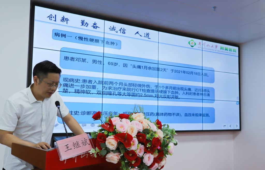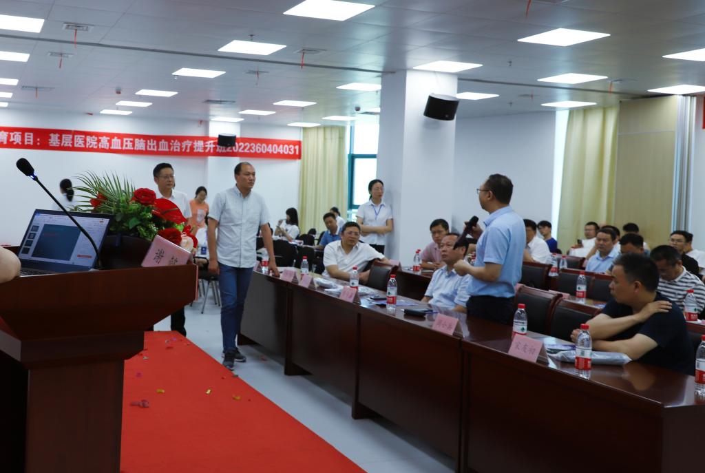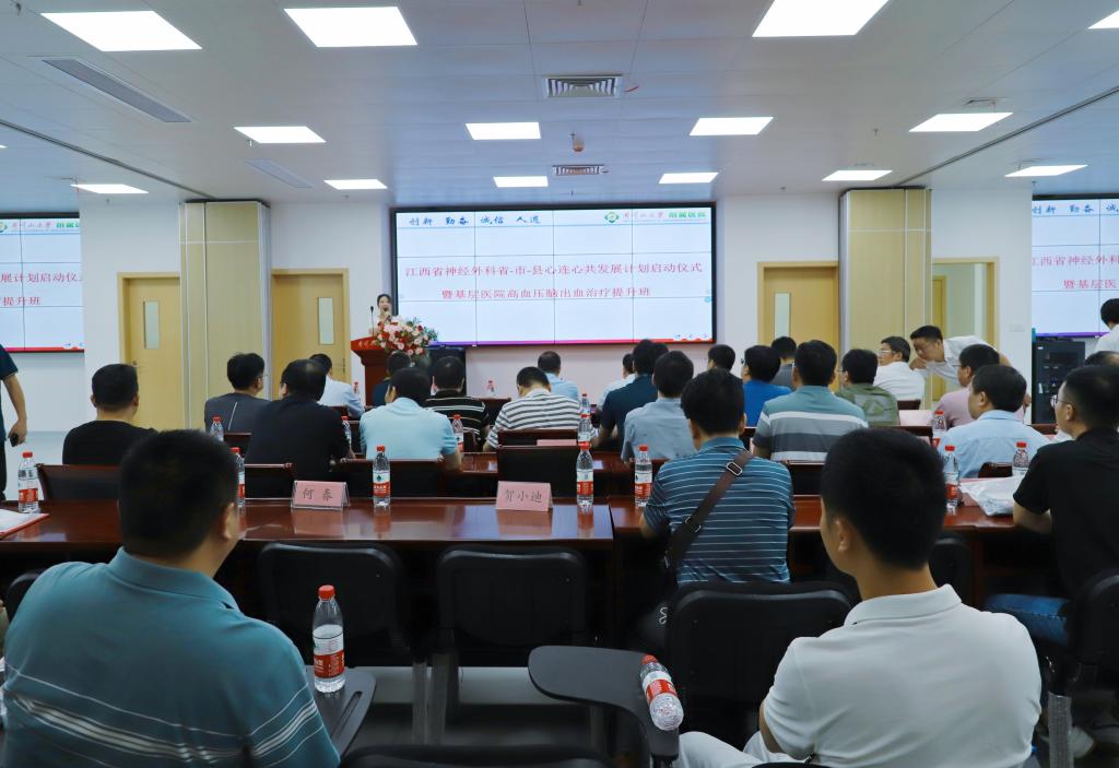 为“努力在以学铸魂 以学增智 以学正风 以学促干方面取得实实在在的成效",提高县市级医院高血压脑出血的诊疗水平,联动各县市级医院实现医疗资源共享,5月28日,江西省神经外科省-市-县心连心共发展计划启动仪式暨基层医院高血压脑出血治疗提升班在井冈山大学附属医院新院区举行。井冈山大学附属医院党委副书记、院长谭立宇出席致辞,江西省人民医院神经外科主任万登峰、南昌大学第一附属医院神经外科副主任孟伟授课,南昌大学第一附属医院神经外科二病区主任周小兵致辞并授课,衡阳市中心医院神经外科主任李远志出席,井冈山大学附属医院神经外科主任沈建忠主持。医院神经外科及相关科室医务人员、吉安地区各县市医院神经外科同仁约100余人参加。