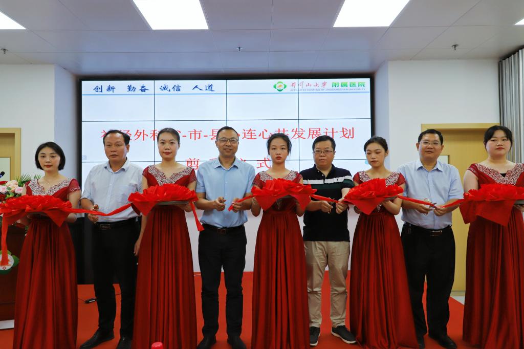 井冈山大学附属医院院长谭立宇,江西省人民医院神经外科主任万登峰,南昌大学第一附属医院神经外科二病区主任周小兵,永丰县人民医院副院长黄传喜,共同为神经外科省-市-县“心连心 共发展”计划启动仪式剪彩。