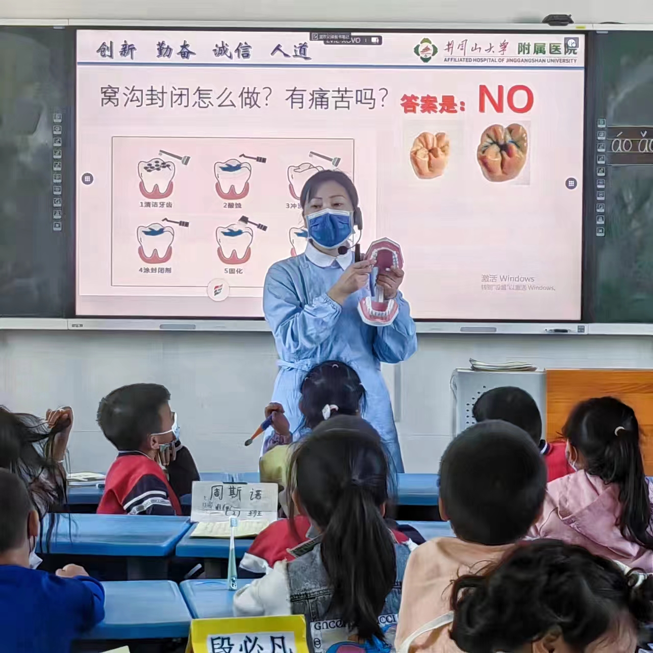 口腔科一直践行中国牙病防治基金会的倡导,成立青年科普讲师团,以公益提升公信力,积极助力口腔公益事业,关注老区人民口腔健康,相继开展了口腔健康进校园、口腔健康义诊进社区、小小牙医、爱牙日口腔健康宣教及预防保健等社会公益活动。受益群众多、宣传面广,营造了关注口腔健康的社会氛围。