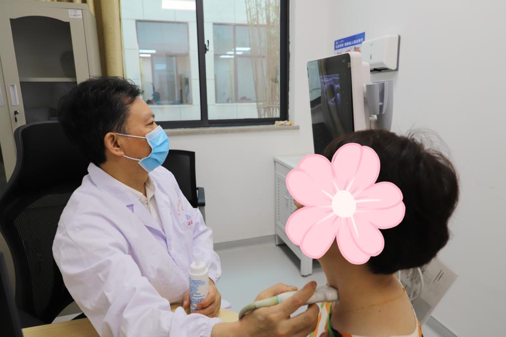 余济春教授亲自为每一位群众行甲状腺彩超检查。