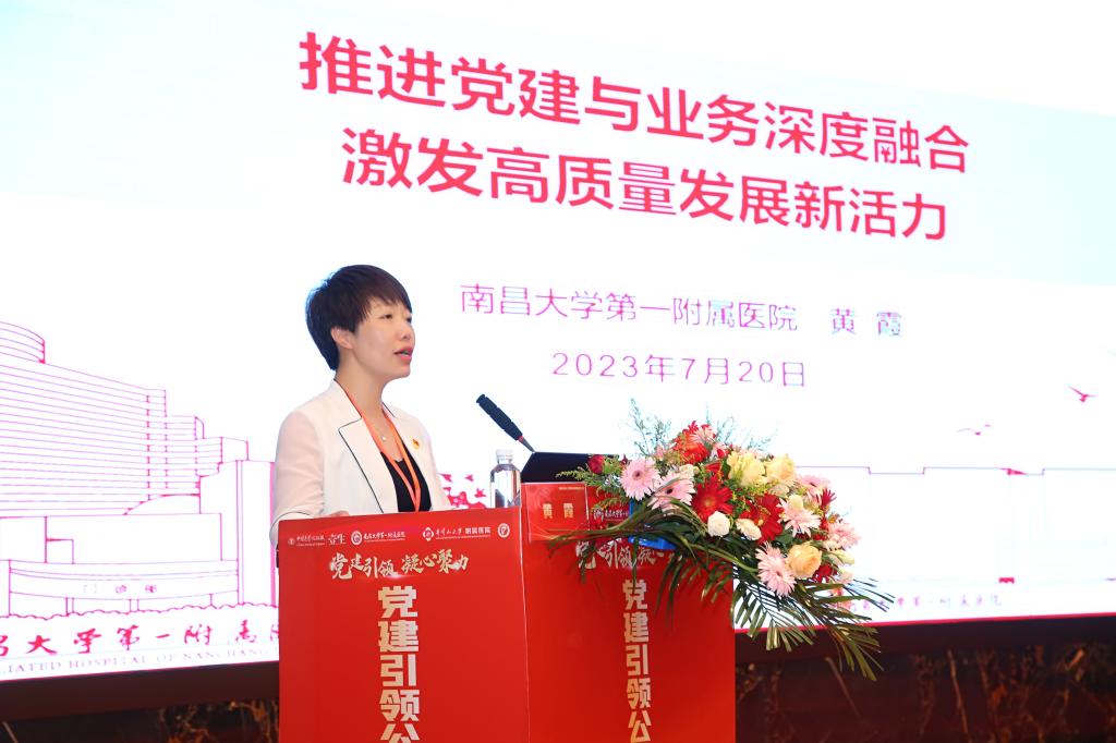 南昌大学第一附属医院副院长黄霞以《推进党建与业务深度融合 激发高质量发展新活力》为题,分享了医院在党建业务深度融合、推动医院高质量发展方面的具体做法、创新举措和经验。公立医院要认真、深入、全面落实中共中央办公厅《关于加强公立医院党的建设工作的意见》,坚持和加强党对公立医院的全面领导,全面提升公立医院党组织和党员队伍建设质量,提升基层党建工作质量,为医院的高质量发展掌舵领航。