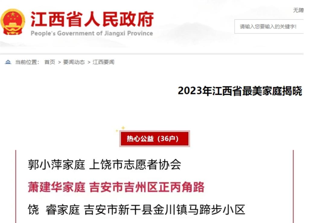 据悉,此次活动揭晓了爱党爱国、清风传家、绿色清洁、爱粮节粮、科技创新、科学教子、孝老爱亲、移风易俗、热心公益、学法用法等10类共400户2023年江西省最美家庭。