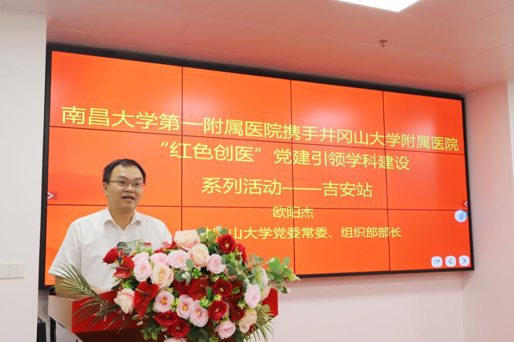 欧阳杰首先代表井冈山大学向南大一附院各位专家的到来表示热烈欢迎,就南大一附院在医疗服务、技术帮扶、人才培养等方面对井冈山大学附属医院的帮助与支持表示感谢,他强调,学科建设是井冈山大学事业发展的龙头和医院高质量发展的核心,也是医院发展的关键、医疗服务水平提升的重要保障。此次“红色创医”党建引领学科建设系列活动对附属医院来说是一个难得的机会,希望附属医院坚持以习近平新时代中国特色社会主义思想为指导,深入学习贯彻落实党的二十大精神,坚持党建工作与学科建设深度融合,聚焦促进医院改革发展目标,实现党建和业务工作同频共振、同向聚合,为打造新时代卫生健康“四区四高地”作出新的更大贡献。
